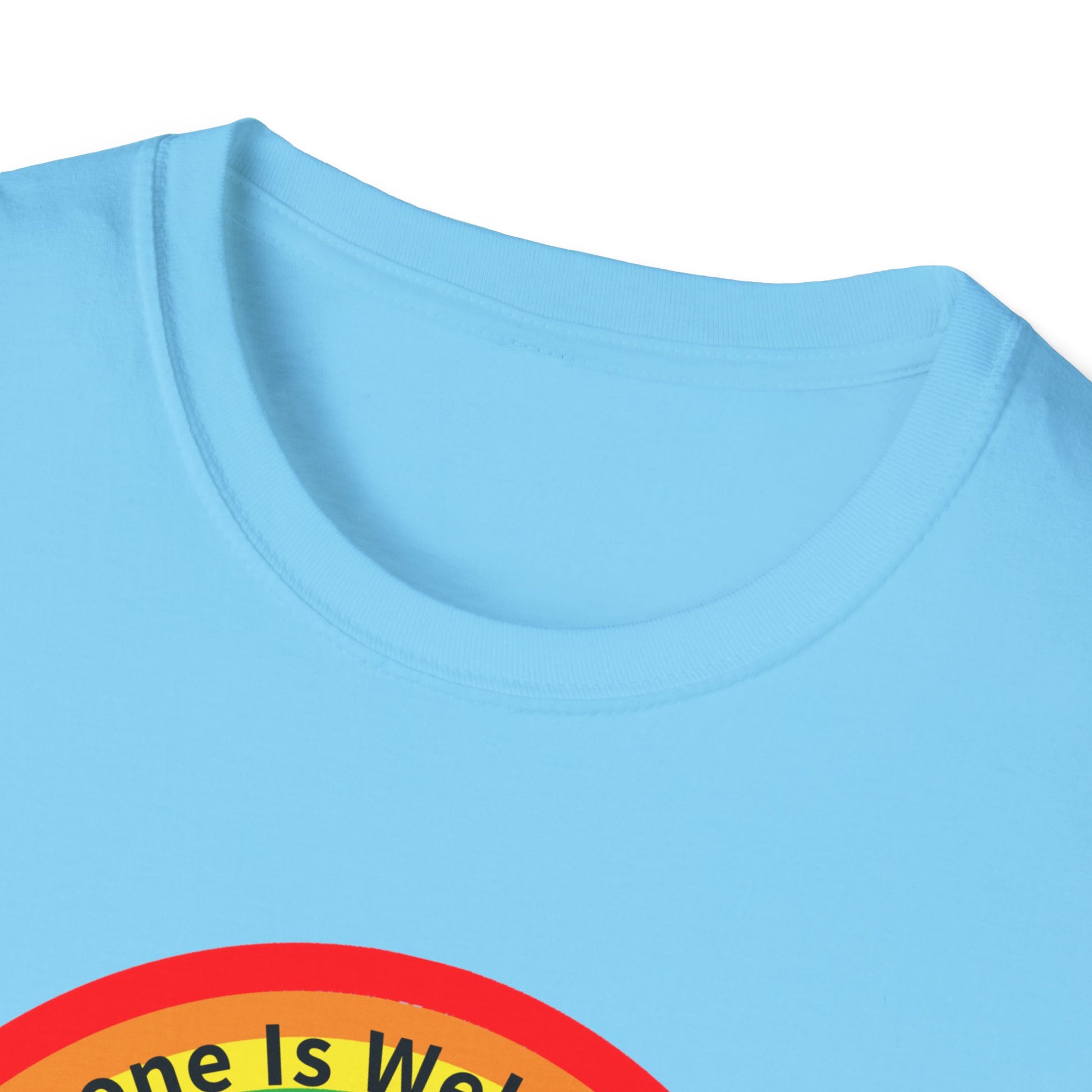 The "Everyone Is Welcome Here" Tee is an inclusive message that all are included. This unisex softstyle T-shirt that offers a comfortable fit and versatile style. Made with 100% ring-spun cotton, this lightweight fabric feels smooth and durable, perfect for printing. The design promotes inclusivity and is suitable for adults of all ages. Ideal for casual wear or as a statement piece for holidays and events celebrating diversity.